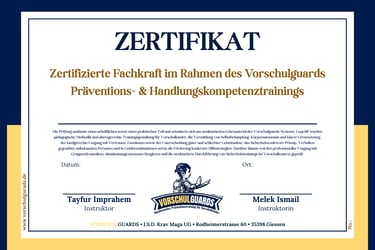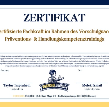Zertifizierte Fachkräfte durchlaufen eine strukturierte Ausbildung (2 Tage Online + 3 Tage Präsenz) und schließen mit einem anerkannten Zertifikat ab – geprüft durch die VORSCHULGUARDS Instruktoren.